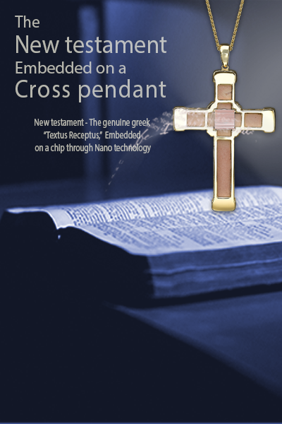 The back of the Cross features the 929 chapters of the New Testament. Using Israeli patented cutting-edge Nanotechnology, the “Textus Receptus,” Latin for “received text,” is genuinely written in ancient Greek
